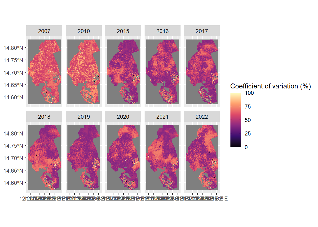 scale_fill_viridis_c("Coefficient of variation (%)", option = "magma")
