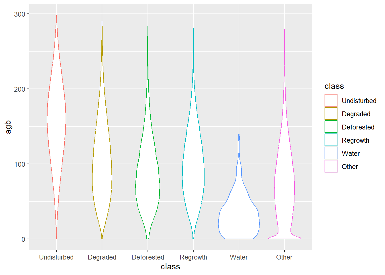 geom_violin(aes(x = class, y = agb, col = class))