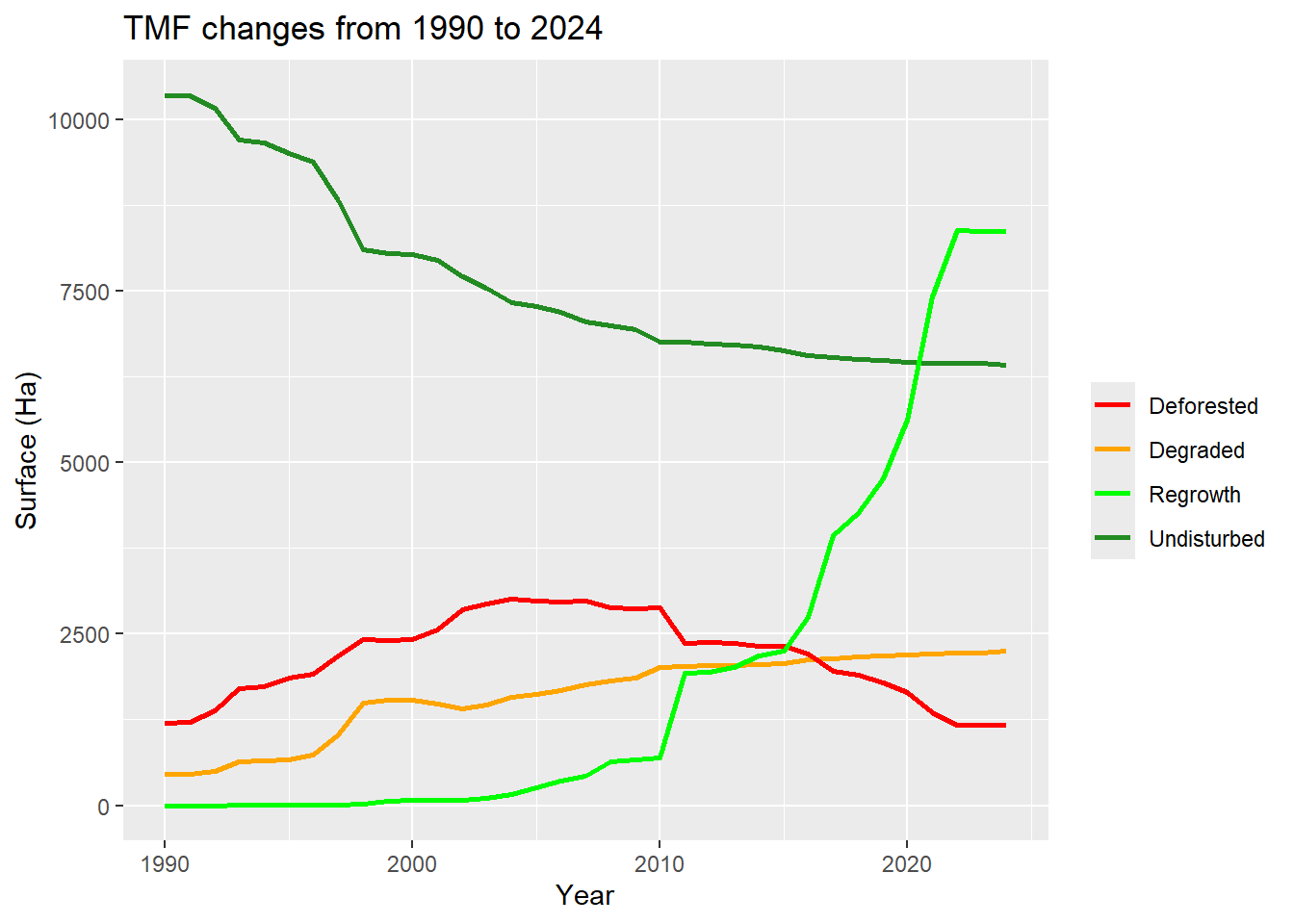 labs(title = "TMF changes from 1990 to 2024", x = "Year", y = "Surface (Ha)")